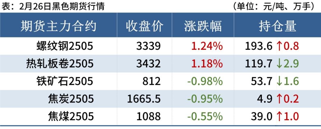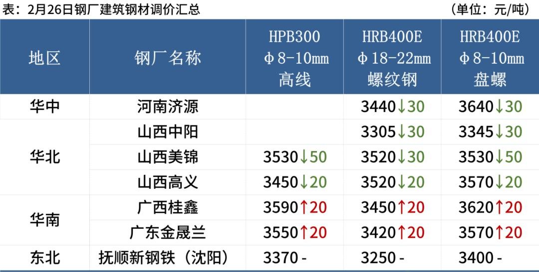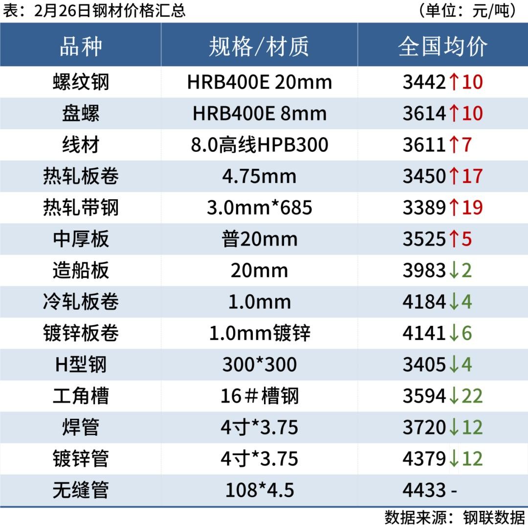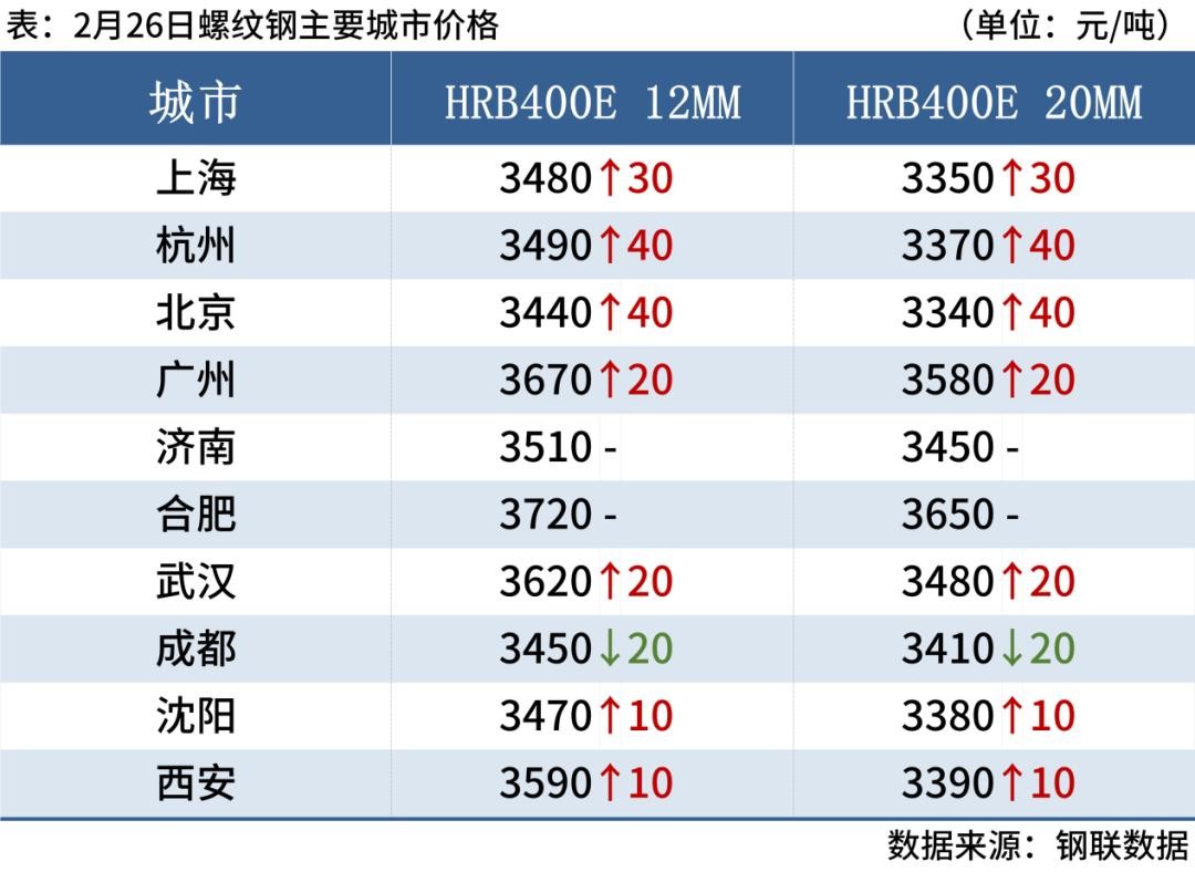 2月26日国内建材价格普涨,涨幅10-40元。期螺大幅上行,主力2505收涨41点,涨幅1.24%,报3339,给予现货价格正面牵引。随着期货上行,盖过昨日跌幅,现货市场信心上涨,经销商反映,出货尚可,较昨日好转。