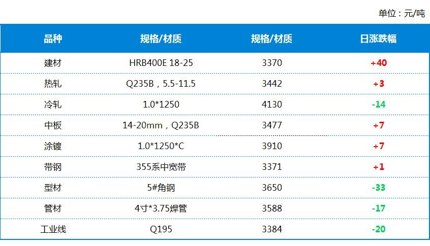1、螺纹钢下调50元/吨:Φ16-25mmHRB400E执行价格为3520元,下调30元,小螺加200元;