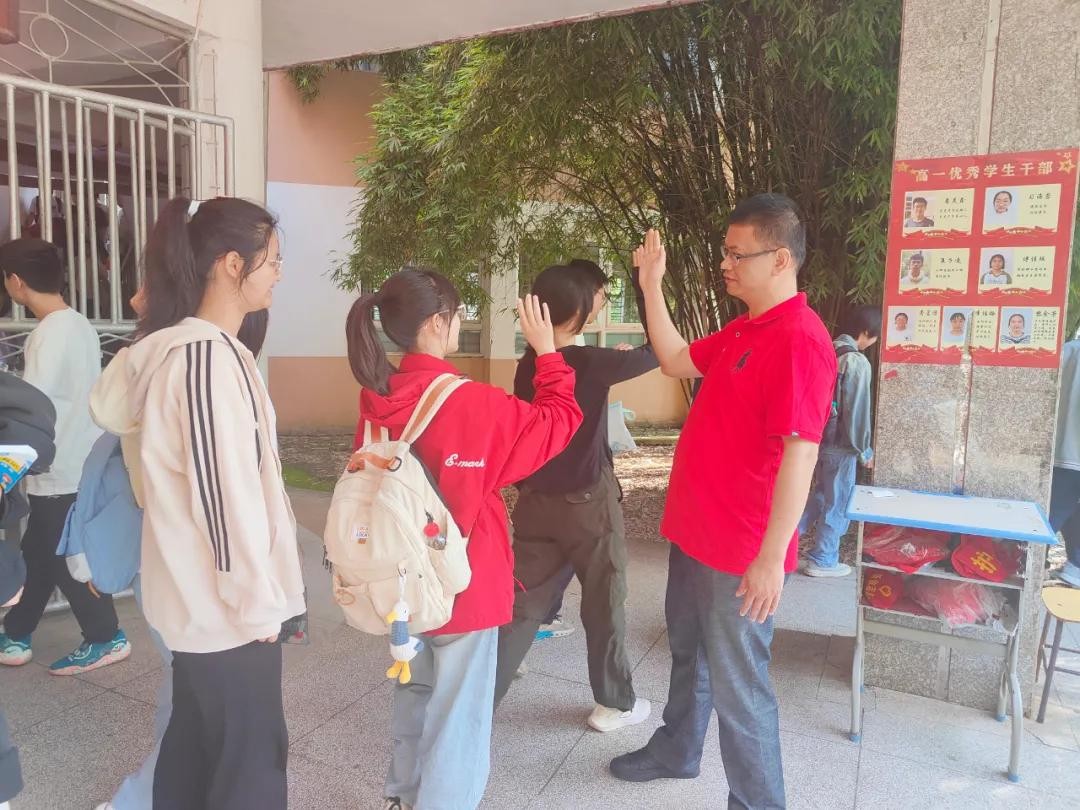 ▲新余市四中考点,老师在考前和考生击掌助威。来源:江西日报