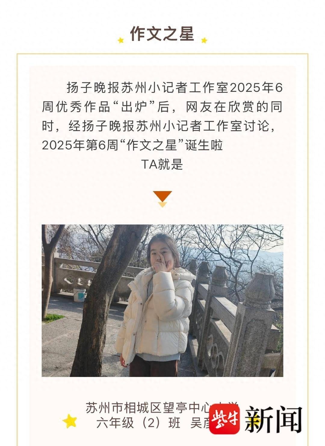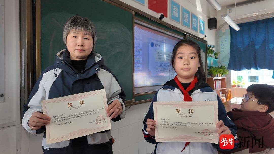2月18日,扬子晚报苏州小记者工作室主持人走进苏州市相城区望亭中心小学,为吴彦霖及六(2)班语文老师郭彩红进行颁奖。