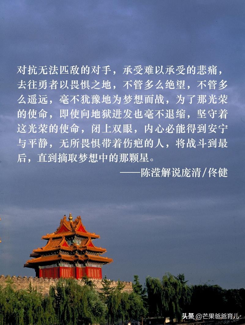 “对抗无法匹敌的对手,承受难以承受的悲痛,去往勇者以畏惧之地,不管多么绝望,不管多么遥远,毫不犹豫地为梦想而战,为了那光荣的使命,即使向地狱进发也毫不退缩,坚守着这光荣的使命,闭上双眼,内心必能得到安宁与平静,无所畏惧带着伤疤的人,将战斗到最后,直到摘取梦想中的那颗星。”