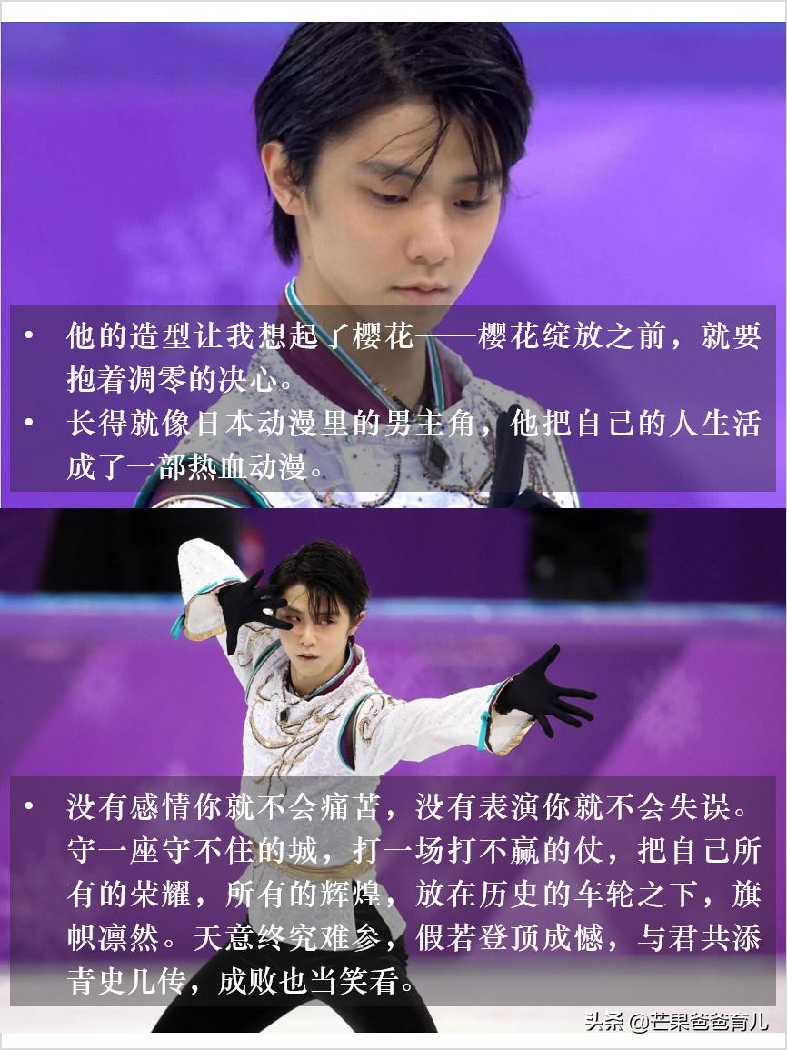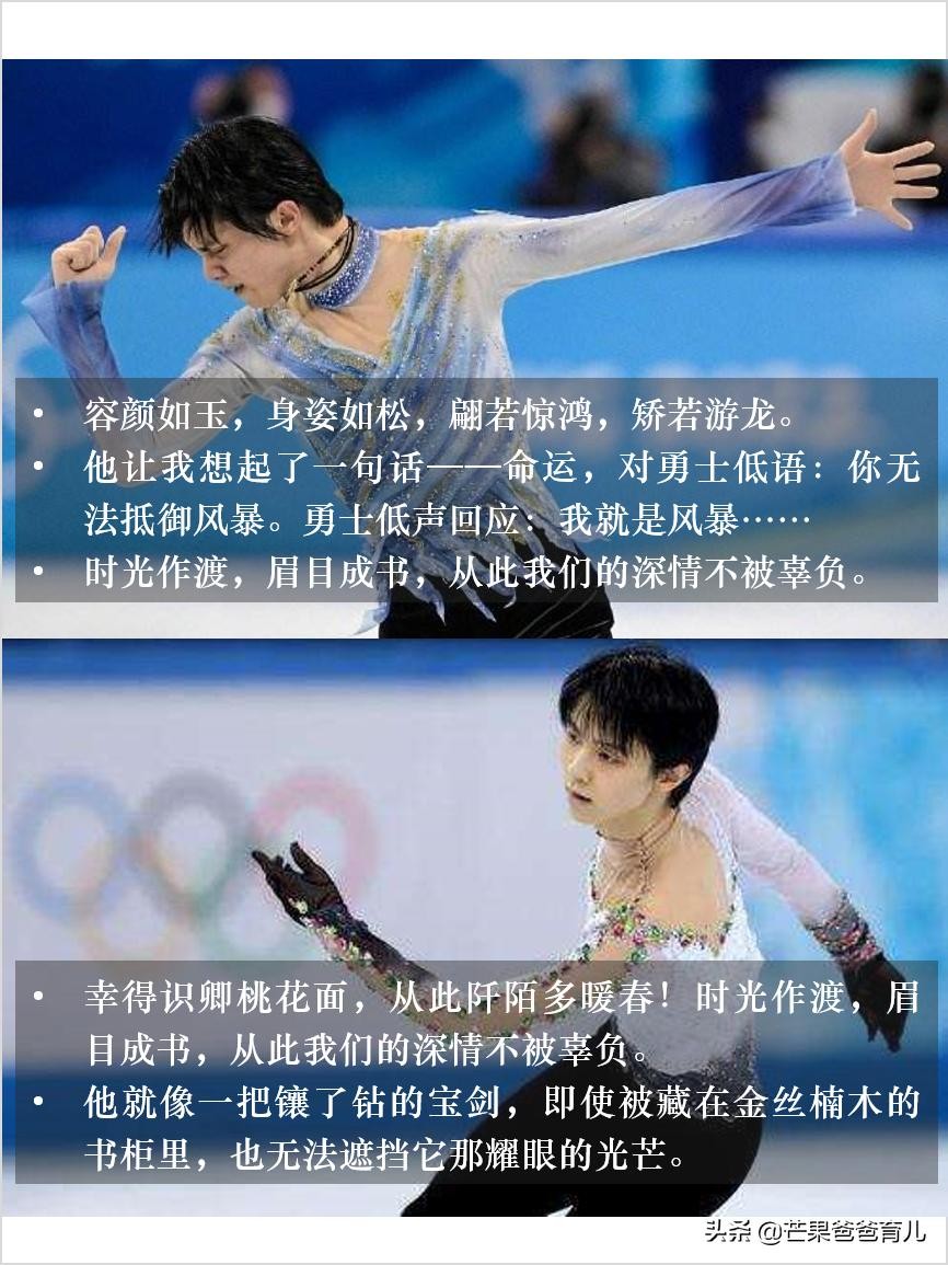 “时光作渡,眉目成书,从此我们的深情不被辜负。”“幸得识卿桃花面,从此阡陌多暖春!我们非常庆幸能够在羽生结弦最美好的年纪遇到了他,时光作渡,眉目成书,从此我们的深情不被辜负,每一段青春都会老去,但是我们的记忆里,永远都会都为羽生结弦留一个位置。”“他就像一把镶了钻的宝剑,即使被藏在金丝楠木的书柜里,也无法遮挡它那耀眼的光芒。他走到哪里,都是所有人的焦点!”“他的造型让我想起了樱花——樱花绽放之前,就要抱着凋零的决心。”