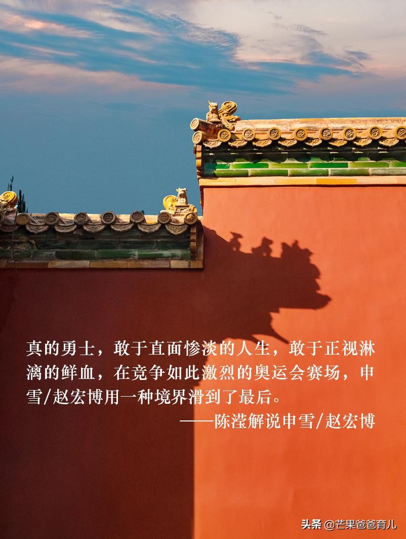 “1998年长野冬奥会,申雪/赵宏博初出茅庐,惊艳;2002年盐湖城冬奥会,四周跳没有成功,铩羽而归;2006年都灵冬奥会带伤上阵,悲壮;2010年的温哥华冬奥会,有一句话我特别感动,形容申雪/赵宏博一点都不为过,‘真的勇士,敢于直面惨淡的人生,敢于正视淋漓的鲜血’,在竞争如此激烈的奥运会赛场,申雪/赵宏博用一种境界滑到了最后。”