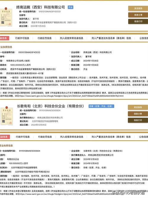 12月6日,董宇辉成立了长歌有和(北京)科技合伙企业和终南远眺(西安)科技有限公司这两家他口中的小公司。