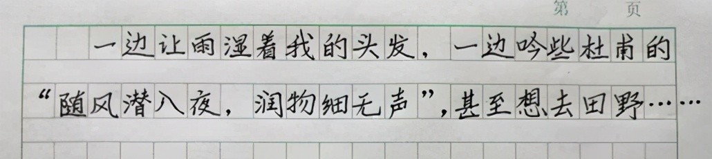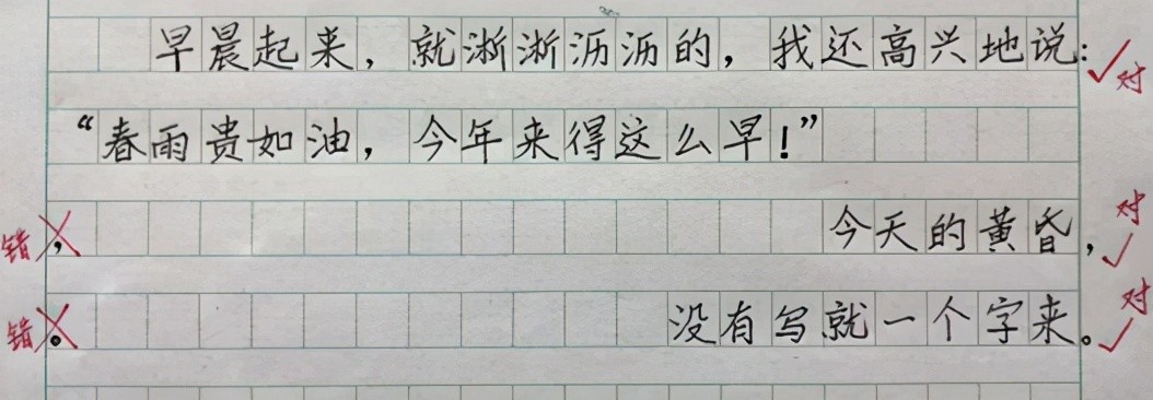 1. 七种点号不要写在一行之首。点号,即逗号、顿号、句号、分号、冒号、问号、叹号,表示语气和停顿,必须紧跟在句子后面,如果上一行写到最后一个字占满了作文格,点号就写在作文格之外,大约相当于有作文格的偏左下方的位置,不能写在下一行的开头。